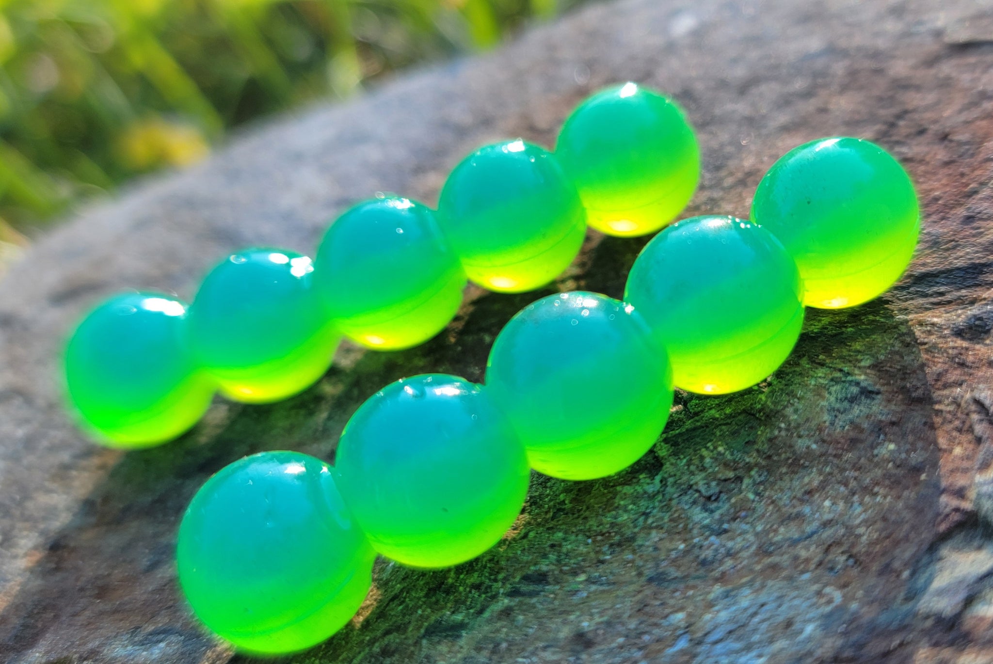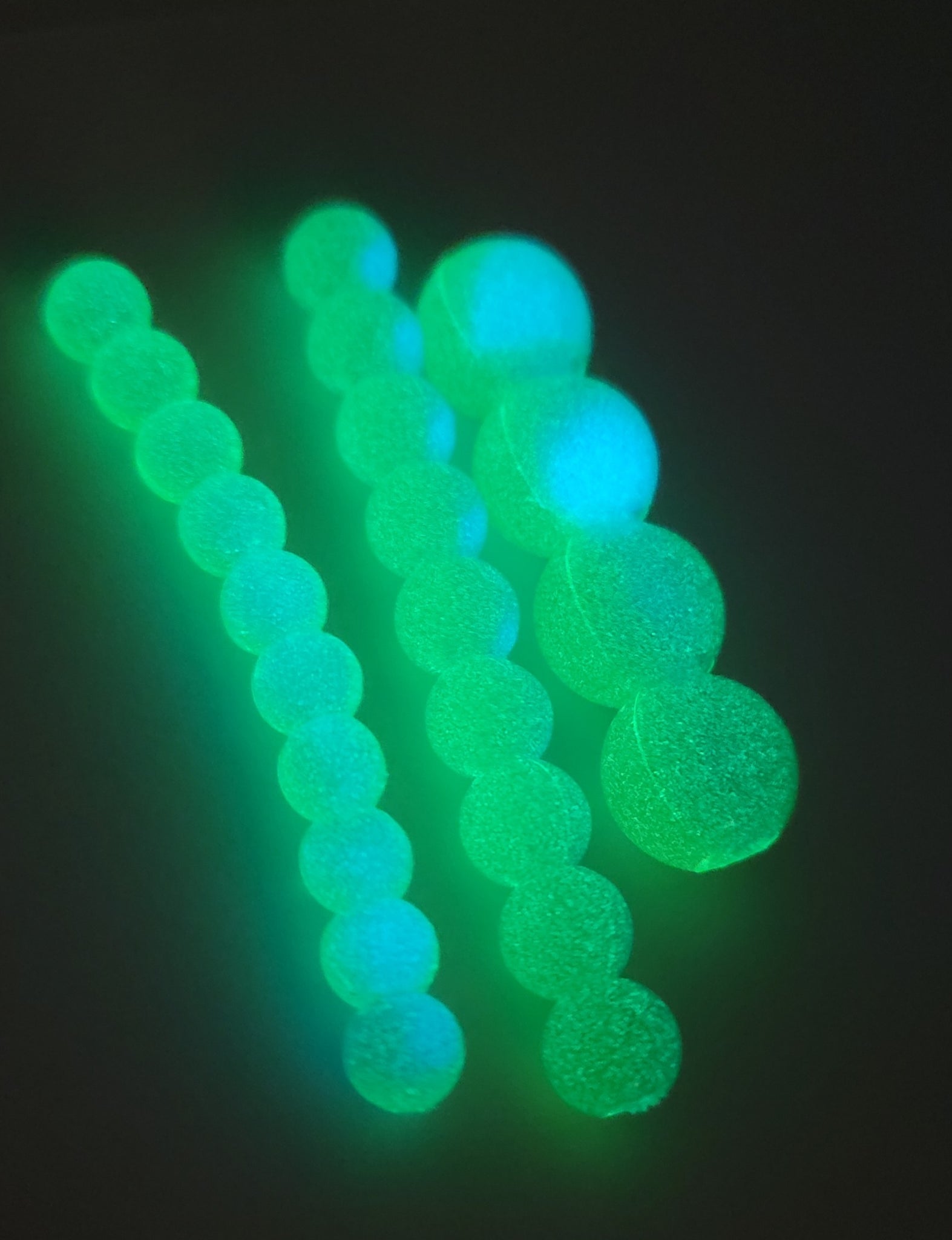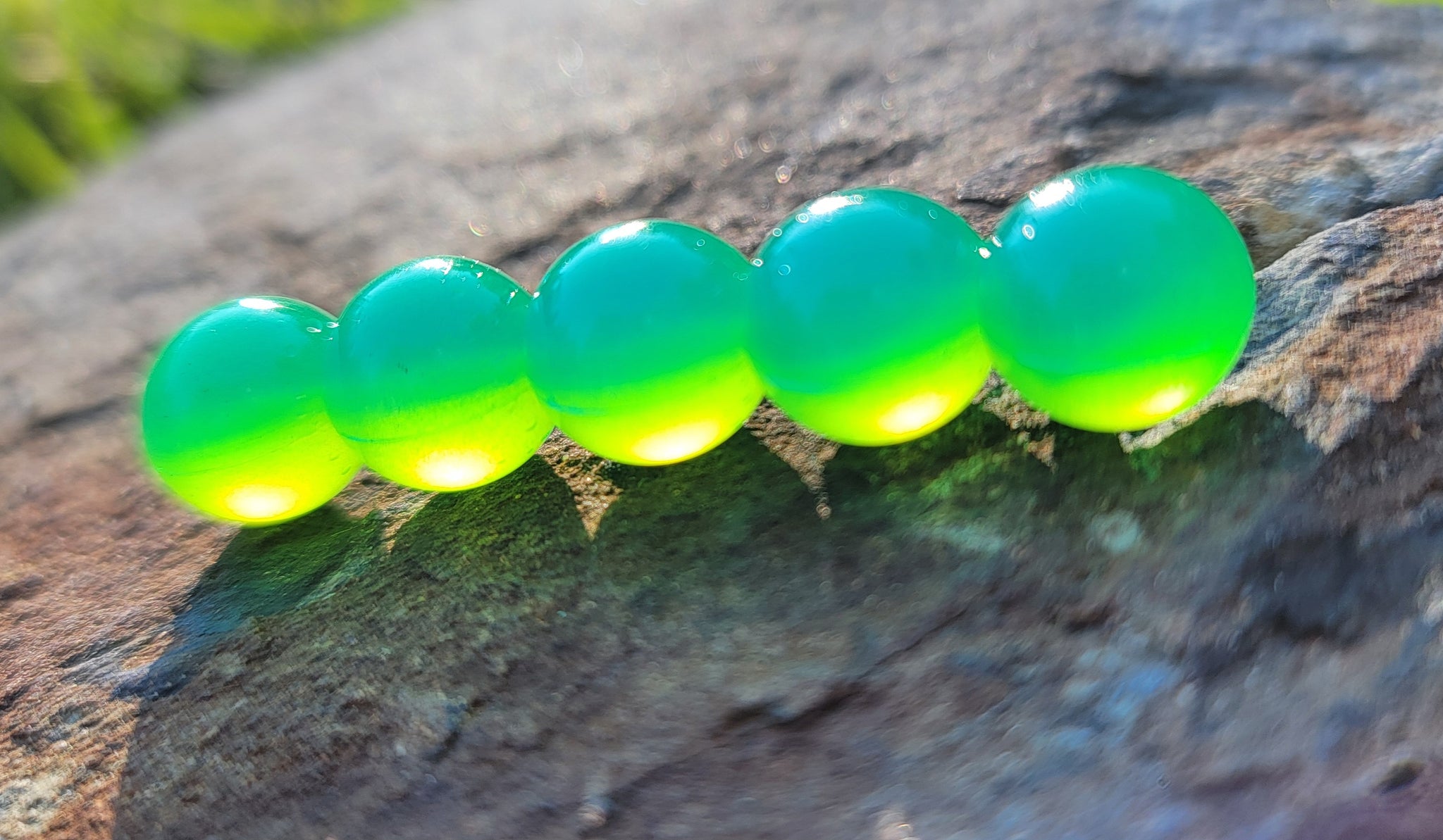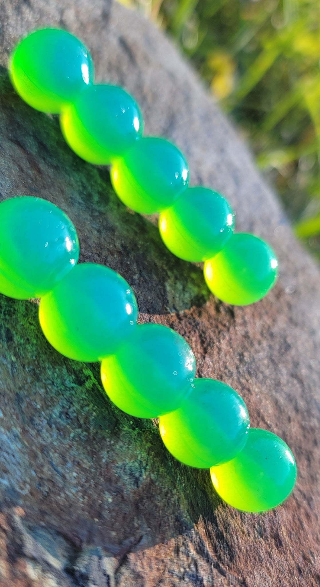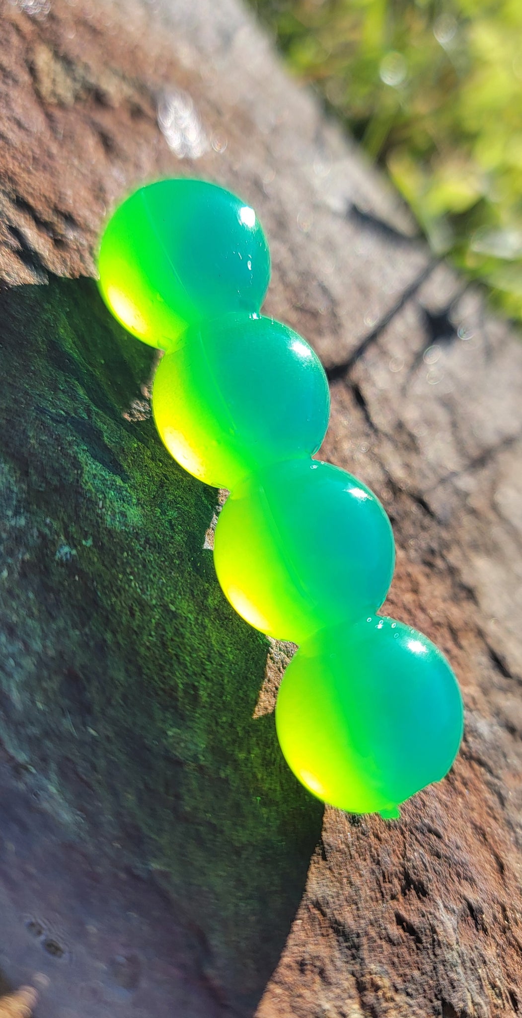 Blue, green and chartreuse mixed into one bead. Uv and glow in the dark powder added.
